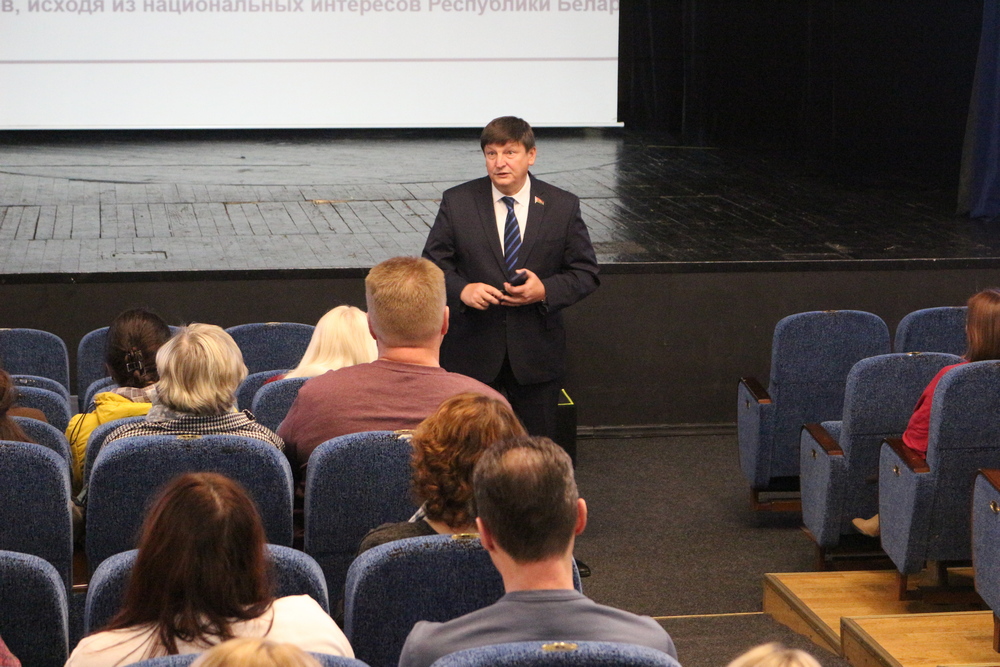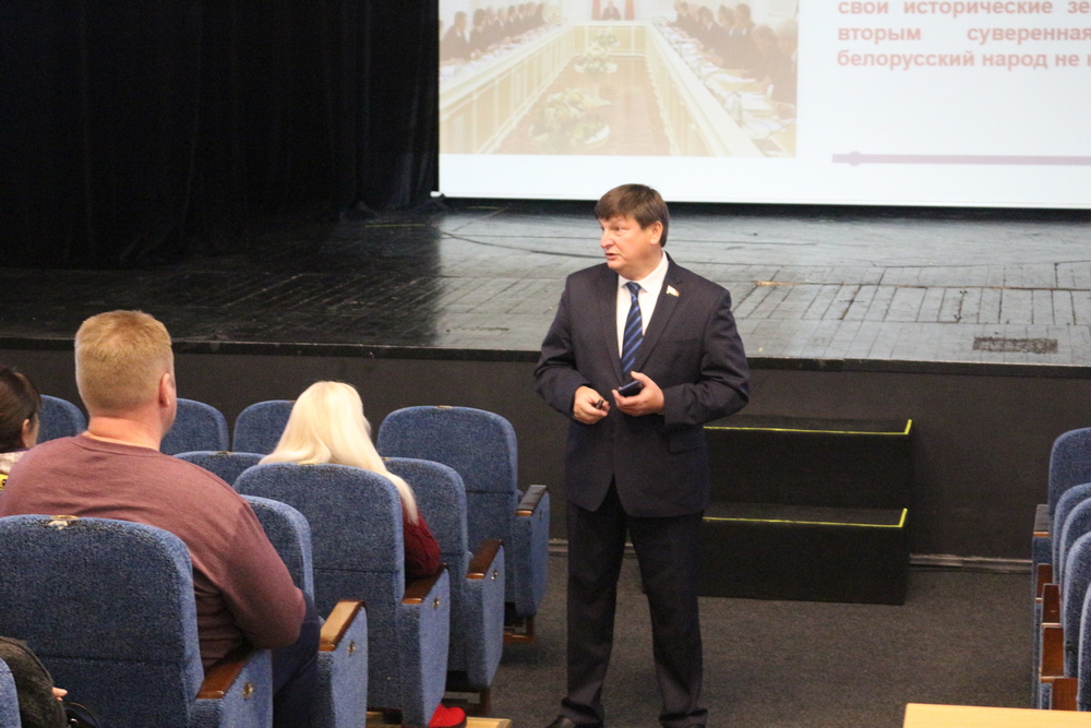 Сегодня, в рамках Единого дня информирования, с лекцией на тему «Историческая политика Республики Беларусь как фактор укрепления государственного суверенитета страны», выступил Председатель Постоянной комиссии по образованию, культуре и науке Национального собрания Республики Беларусь, доктор исторических наук, профессор Игорь Александрович Марзалюк.