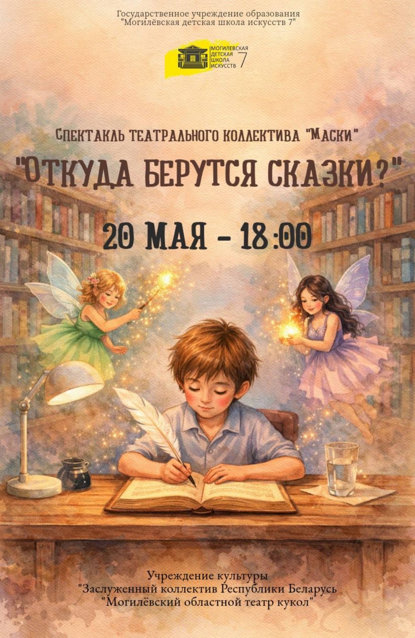 20 мая в 18:00 Могилевский областной театр кукол приглашает на спектакль «Откуда берутся сказки?», который покажут воспитанники театрального коллектива «Маски» государственного учреждения образования «Могилевская детская школа искусств №7».